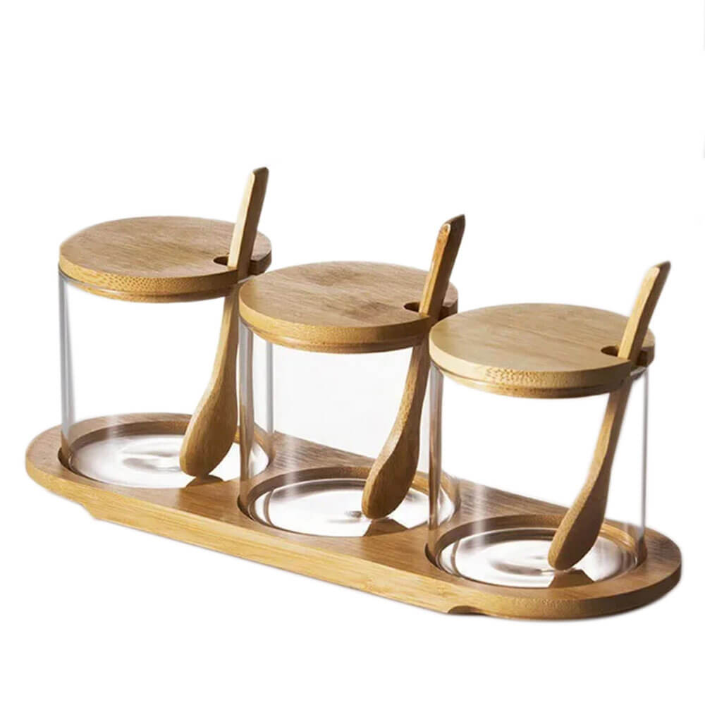 Organize your kitchen in style with these elegant stacking canisters. Crafted from durable glass and complemented by eco-friendly bamboo lids and matching wooden spoons. The included wooden tray keeps your essentials—like spices, coffee, or tea—neatly displayed and easily accessible. Each lid features an airtight seal to maintain freshness, while the see-through design allows you to quickly identify contents. Perfect for modern or minimalist kitchens, these canisters combine functionality with natural beauty to simplify your storage needs.